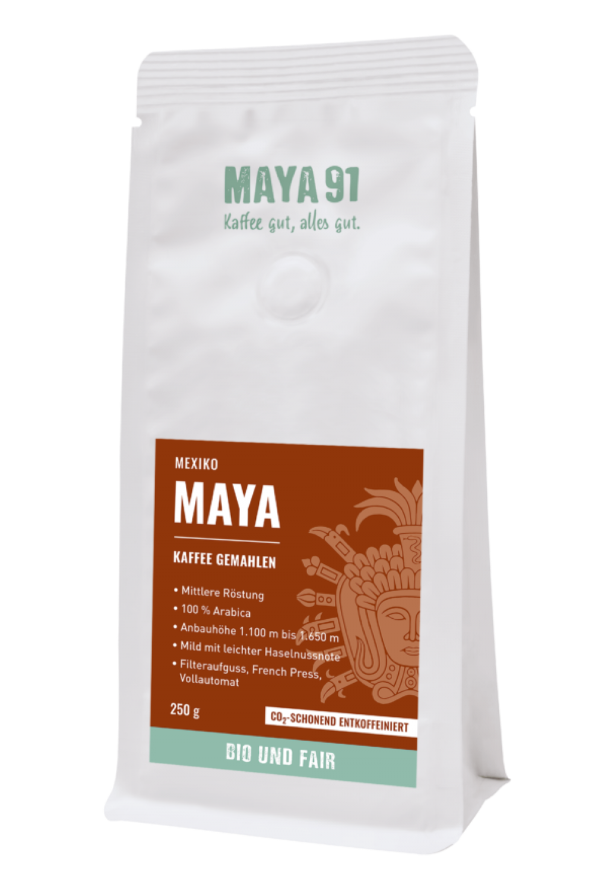 MAYA Filterkaffee ist äußerst ergiebig und hat praktisch keine Säure. Den Gaumen umschmeichelt ein vollmundiges Haselnussaroma. Gleich probieren!