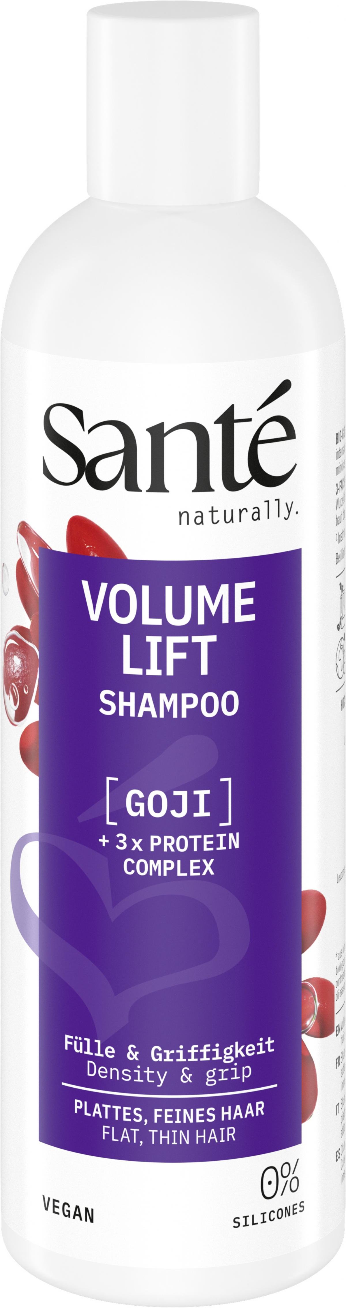 Das VOLUME LIFT Shampoo für plattes, feines Haar, besteht aus einer hochwirksamen Pflegeformel mit Bio-Goji und 3-Fach Protein Komplex. Es dringt besonders wirksam tief in das Haar ein und baut intensives Volumen auf. Für spürbar griffiges, schwungvolles und voluminöses Haar ohne zu beschweren. Der 3-Fach Protein Komplex stärkt, pflegt & schützt das Haar von der Wurzel bis in die Spitzen. Der hydratisierende Pflege-Komplex füllt & baut das Haar auf, für eine natürlich kraftvolle Haarstruktur. Die Verträglichkeit ist dermatologisch getestet.